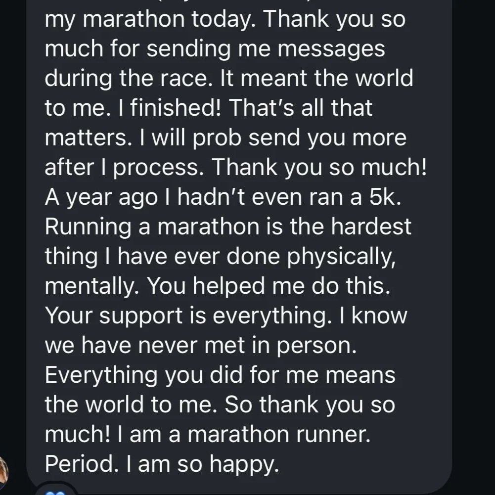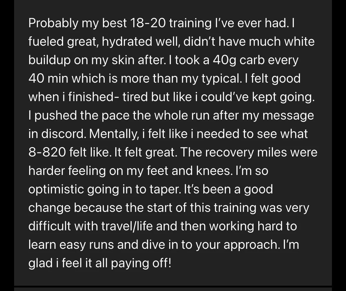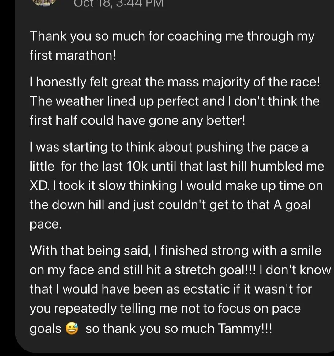Your training plan will be customized for your goal marathon or half marathon, and your paces will be customized for you in the platform based on a recent race [or time trial when you start]. The plan is also customized for your starting mileage and will progress accordingly. It is NOT customized for your individual schedule or any other races outside of the goal race, however, you can use the videos in the materials to help you make adjustments, as well as ask Tammy questions in Discord.